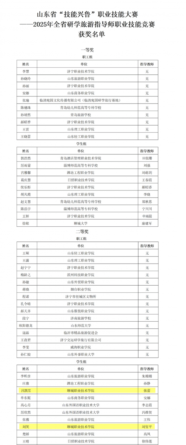 11月7日,山東省“技能興魯”職業(yè)技能大賽——2025年全省研學(xué)旅游指導(dǎo)師職業(yè)技能競(jìng)賽獲獎(jiǎng)名單正式公布,聊城職業(yè)技術(shù)學(xué)院喜訊頻傳:該校劉笑、呂凱雪兩位選手在劉寶平老師、張蕾老師的指導(dǎo)下榮獲省賽二等獎(jiǎng)。