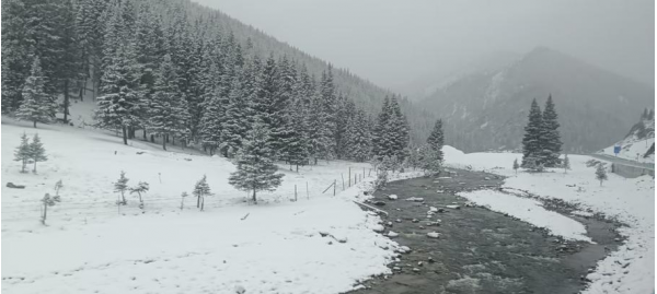 午后依依不舍地離開可可托海鎮(zhèn),沿331國(guó)道向阿勒泰進(jìn)發(fā),神奇的北疆又給了我們意外的驚喜——漫天飛雪悄然降臨。細(xì)密的雪花紛紛揚(yáng)揚(yáng)落下,給路旁的樹木披上了一層薄紗,金黃的葉片與潔白的雪花相映,構(gòu)成了“一半金秋,一半冬雪”的奇景。車輪碾過(guò)薄薄的積雪,發(fā)出“咯吱”的輕響,車窗外風(fēng)景不斷變換,時(shí)而穿過(guò)雪霧彌漫的山林,時(shí)而望見開闊的雪原,每一處都像闖入了童話世界。這場(chǎng)不期而遇的雪,讓旅途多了幾分詩(shī)意與浪漫,也讓我們更深刻地體會(huì)到北疆“一日四季”的神奇。為了確保安全,我們?cè)?866公里標(biāo)志牌拍照留念后,又掉頭改道走高速奔赴阿勒泰。