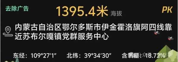 今天早晨起床搜百度這里海拔1395.4米在內蒙古自治區(qū)鄂爾多斯市伊金霍洛旗阿四線靠近蘇布爾嘎鎮(zhèn)黨群服務中心東經:109°27'1”北緯:39°34'30"含氧量:18.72%