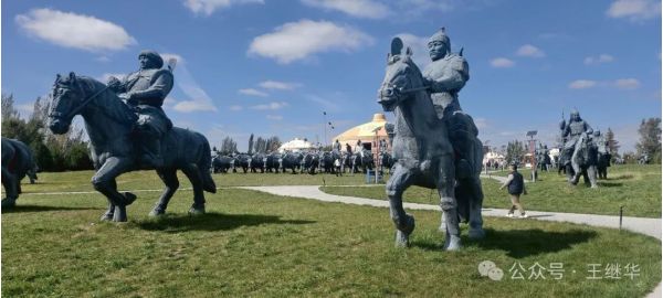 從蒙古包到成吉思汗陵,不過四分鐘車程。車剛停穩(wěn),仰頭便見“氣壯山河”石門劈開蒼穹,氣勢(shì)撼人。劉總摸著銅鑄的鐵馬金帳群雕感嘆:“你看這馬鬃,風(fēng)從哪個(gè)方向來,它就朝哪個(gè)方向揚(yáng)。”話音未落,一陣風(fēng)恰好掠過,雕像鎧甲上的浮塵簌簌掉落,恍惚間真有戰(zhàn)馬嘶鳴穿透時(shí)空,在耳畔回響。