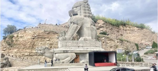 走出紀(jì)念區(qū),我們驅(qū)車(chē)10分鐘抵達(dá)石魂廣場(chǎng)。這里是“石雕之鄉(xiāng)”綏德的另一張名片,以?xún)勺?9.5米高的巨型石獅(赑屃馱負(fù))為核心,為中國(guó)最大石獅。