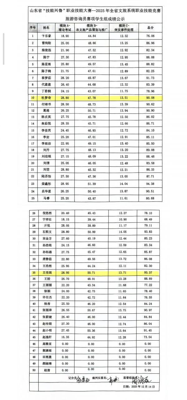 12月14日,2025年山東省“技能興魯”職業(yè)技能大賽全省文旅系統(tǒng)旅行社咨詢員賽項(xiàng)順利收官,聊城職業(yè)技術(shù)學(xué)院學(xué)生表現(xiàn)亮眼,佳績的背后,離不開劉寶平老師和李雁老師的悉心點(diǎn)撥與傾囊相授,從賽事要點(diǎn)拆解到實(shí)戰(zhàn)模擬演練,他們始終與選手并肩前行。聊城職業(yè)技術(shù)學(xué)院文旅學(xué)子杜夢奇和王佳琪出征賽場,以專業(yè)為刃、以匠心為鋒,在全省200余支隊(duì)伍的激烈角逐中突圍,將一等獎(jiǎng)、二等獎(jiǎng)收入囊中,盡顯青春風(fēng)采。