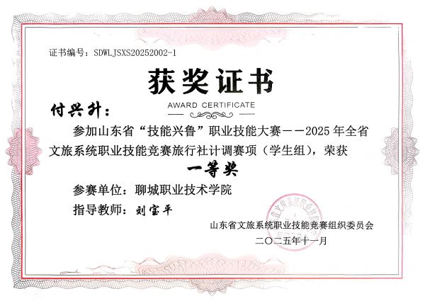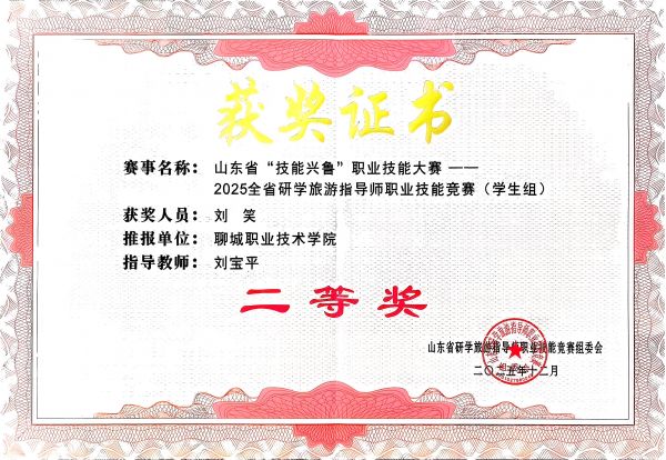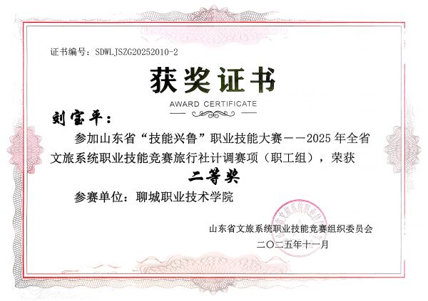 山東省“技能興魯”職業(yè)技能大賽—2025年全省文旅系統(tǒng)職業(yè)技能競賽旅行社計調(diào)賽項二等獎