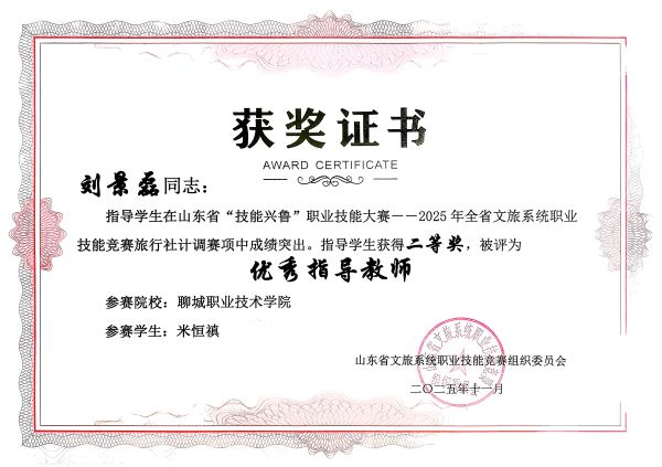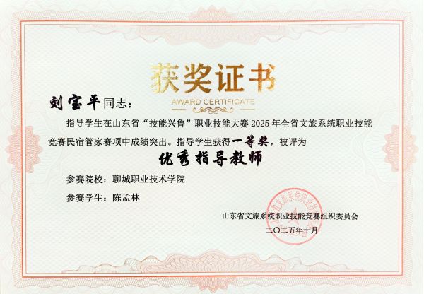 山東省“技能興魯”職業(yè)技能大賽—2025年全省文旅系統(tǒng)職業(yè)技能競賽民宿管家賽項優(yōu)秀指導老師