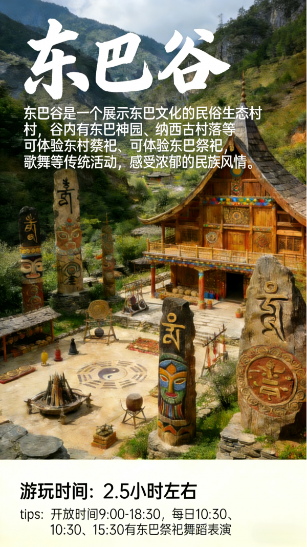 東巴谷則是一個充滿神秘色彩的地方,谷內(nèi)有許多東巴文化的雕塑和建筑,