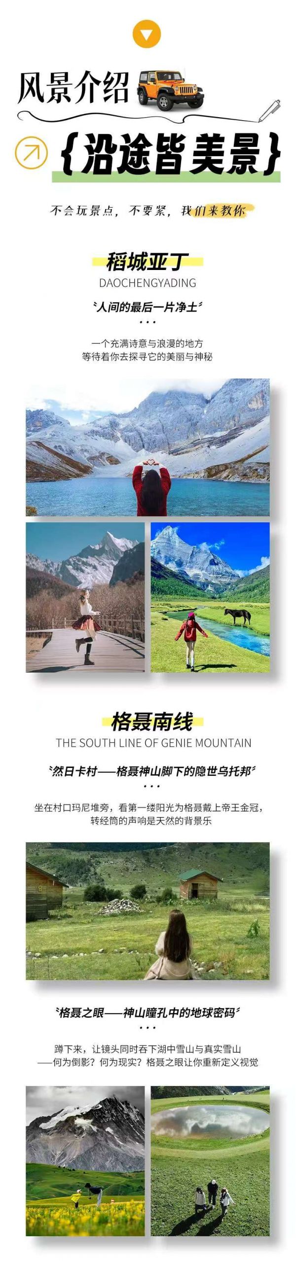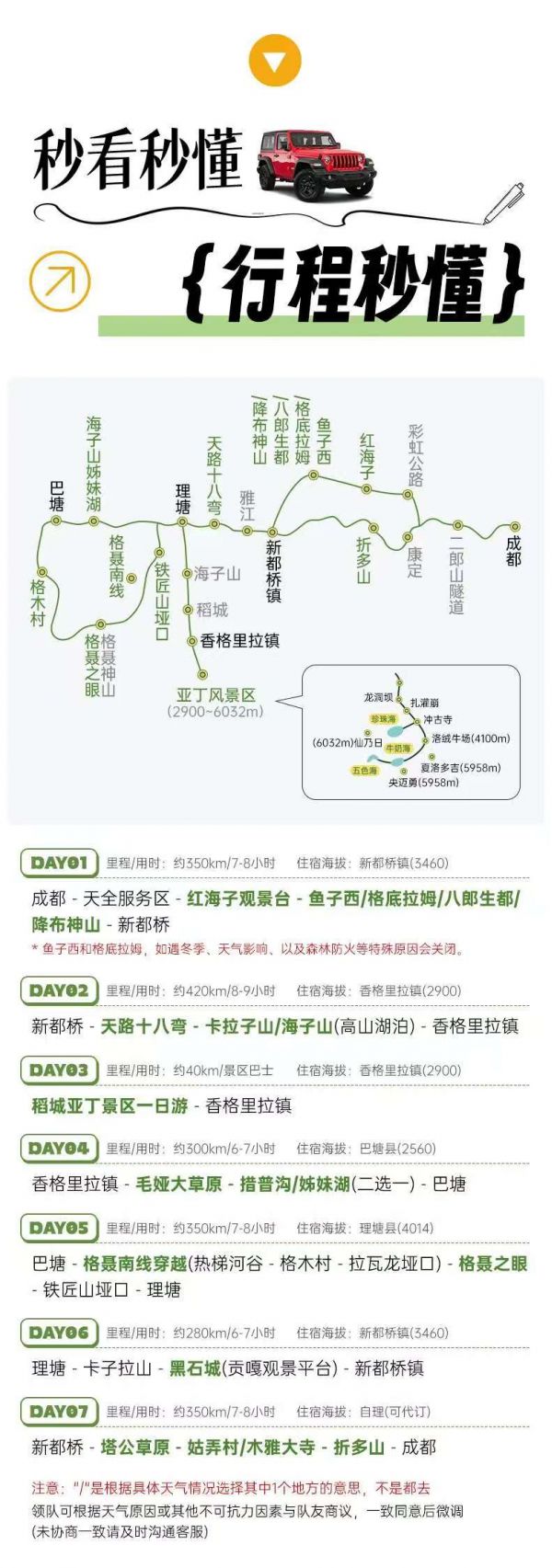 景點(diǎn)海拔:天全服務(wù)區(qū)(680)、紅海子觀景臺(tái)(4100)、魚子西/格底拉姆/八郎生都/降布神山(4200)