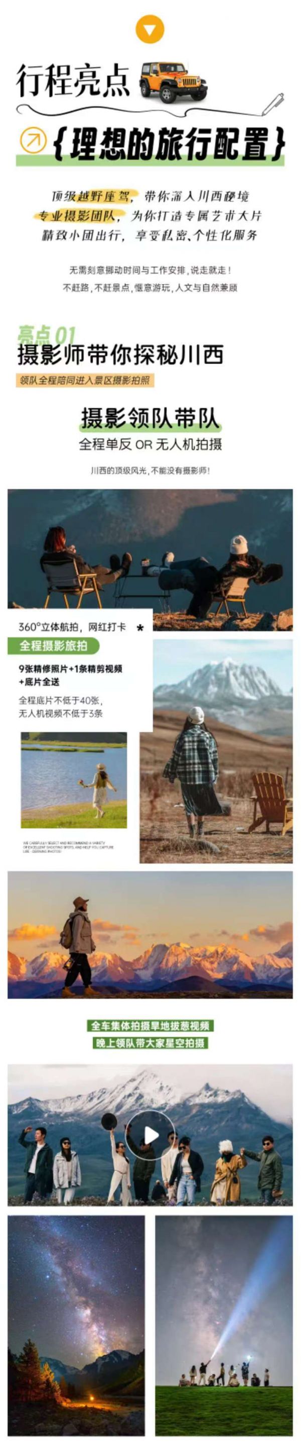 無(wú)人機(jī)+單反旅拍(底片全送+9張精修照片+1條精剪視頻),底片全程不低于40張,無(wú)人機(jī)視頻不低于3條(全車人拍攝旱地拔蔥視頻,晚上領(lǐng)隊(duì)帶大家星空拍攝);