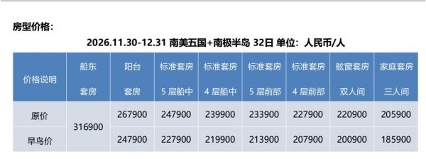 早鳥價(jià): 除船東套房外,其他房型早鳥價(jià)立減 2 萬元/人,優(yōu)惠截止于 2026/2/28備注: 6人起發(fā),10人起派領(lǐng)隊(duì),需自備美簽