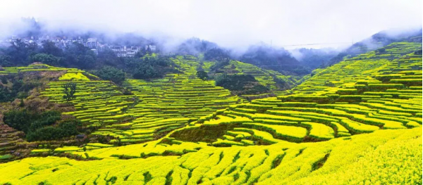春到篁嶺,周邊千畝梯田簇?fù)恚诺挠筒嘶ǜ傁酄幤G,芳馨誘人,一片黃色的海洋,展示出一幅驚艷的“大地藝術(shù)”美圖。