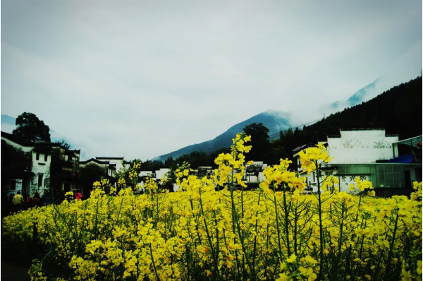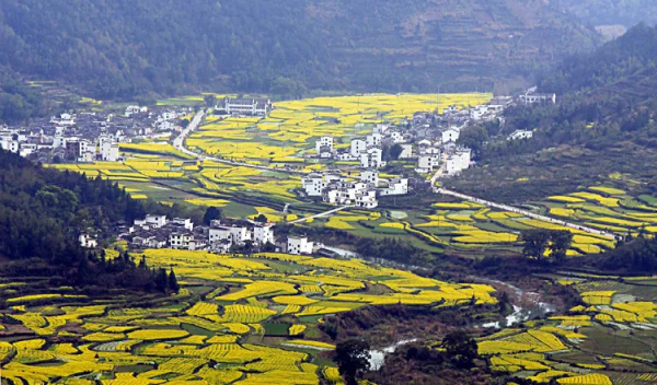 走進(jìn)徽州,仿如步入油菜花的天堂,金黃綢帶是一條引向油菜花天堂的路。