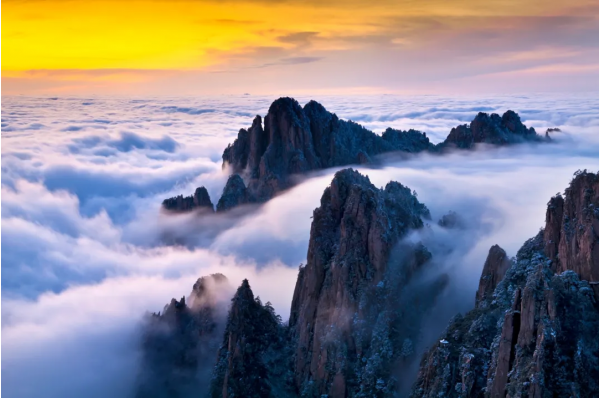 一座不在五岳之中的山,卻集泰山之峻、華山之險、峨眉之秀、雁蕩之奇于一身,又兼有遒勁盤曲的蒼松、奇巧別致的怪石、翻騰洶涌的云海、常年不息的溫泉,原本默默無名的黃山,就這樣以包羅萬象卻自成一體的豐富,從安徽南部的煙雨迷霧中,走入文人的詩詞文章,進(jìn)入萬千大眾的眼界中。