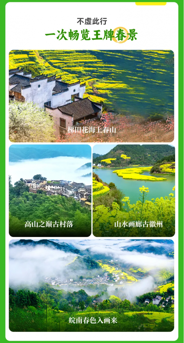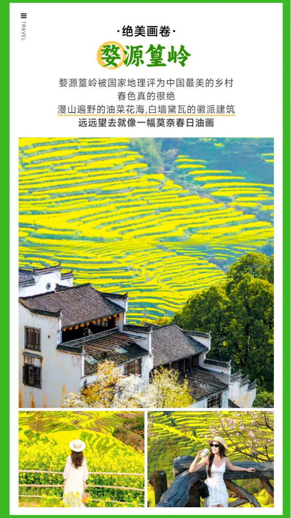 早餐后前往【篁嶺】(車程約1.3小時,75公里左右,游玩約4小時),開啟花海之旅,漫步千畝油菜花盛裝綻放,桃花花、杜鵑花爭奇斗艷,形成“窗銜篁嶺千葉匾,門聚梯田萬畝花”的美景。