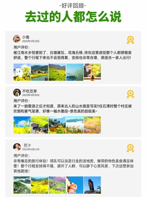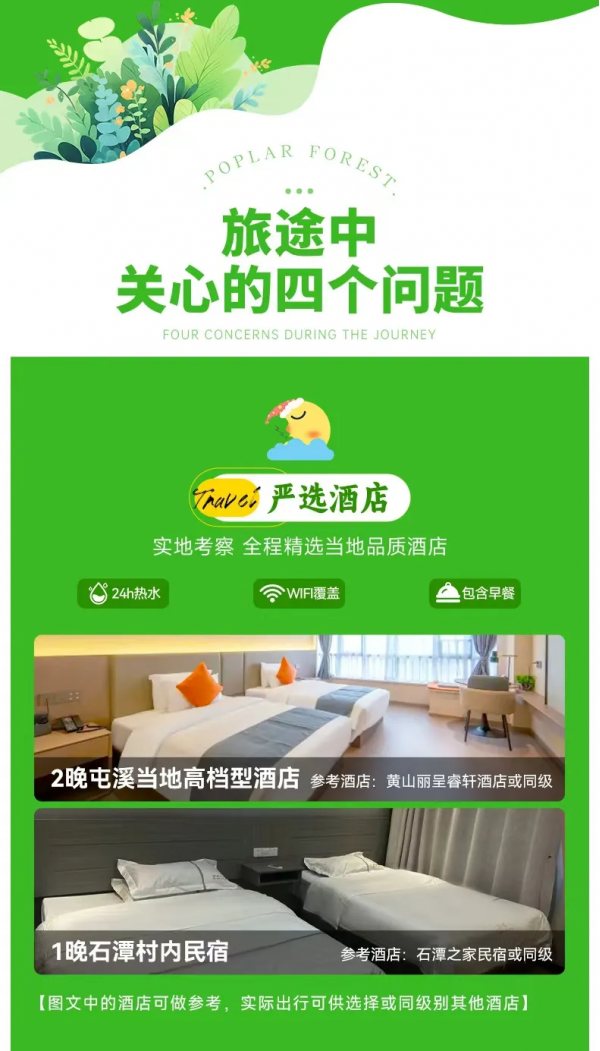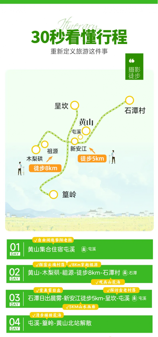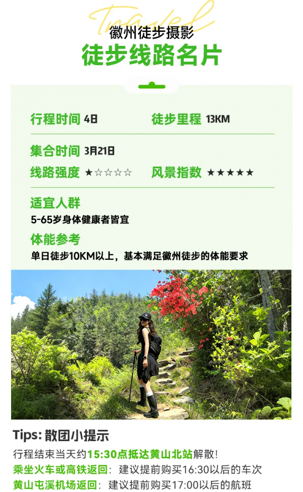 行程結(jié)束當天預計15:30點抵達黃山北站解散,前往黃山屯溪機場可打車(用時約25分鐘),火車/高鐵建議購買16:30以后的車次!飛機建議買16:30以后的航班。