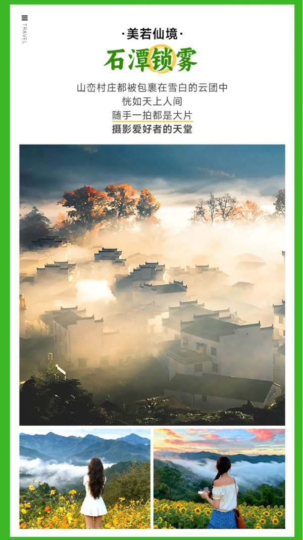 今天早起觀“石潭晨霧”,晨霧裊繞,隨著太陽的逐漸升起,霧氣慢慢散去,露出徽派特有的白色建筑。看完日出后,大家可以在村里漫步行攝,也可以自行準備徒步路餐。