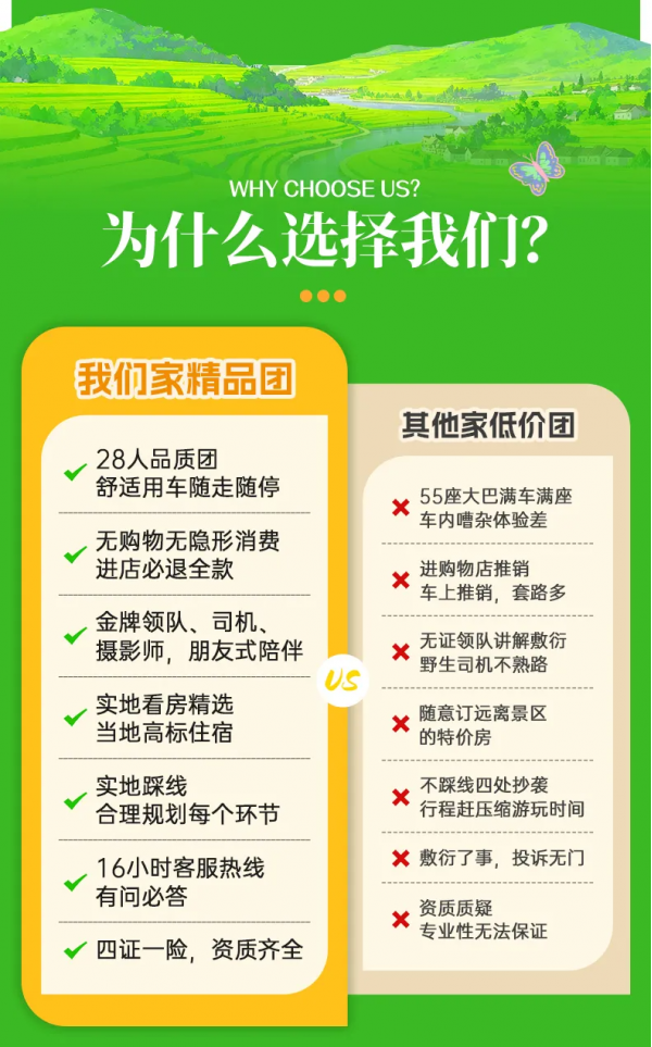 ● 在活動行程中,景區(qū)、餐廳、休息區(qū)等地存在非本公司安排的購物場所,本公司提醒您,理性消費并索要憑證,如產(chǎn)生消費爭議,將由您與售賣商品的商家自行解決。