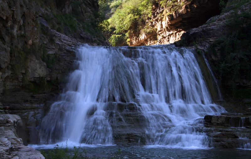 無(wú)獨(dú)有偶,再行5公里之地,又有一個(gè)天生的洗臉盆,面積三分地大,形似滴水盆,圓如規(guī)定徑。水無(wú)源,清波蕩漾;盆無(wú)蓋,一眼見(jiàn)底。當(dāng)?shù)厝藢⒌嗡枧c洗臉盆稱為筋骨相連的子母盆。過(guò)了洗臉盆便是水簾洞。一股兩米寬的泉水從北峽溝的洞中涌出,緩流四五十米后順山崖直壁而下,一派“飛流直下三千尺”的磅礴氣勢(shì)。其后一深洞,嘩嘩瀑布落就半崖伸出的青石板上,打著飛快的漩渦卷人洞內(nèi),而后又從洞底端漏口處噴出,驚濤駭浪之聲震山蕩谷。