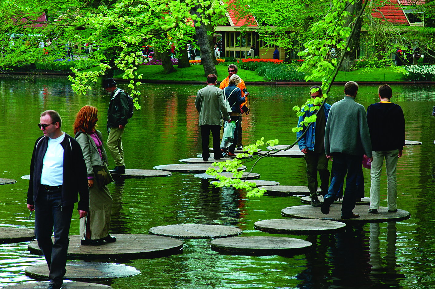 1830年荷蘭聘請(qǐng)德籍的景觀園藝家,設(shè)計(jì)庫肯霍夫公園(Keukenhof)的藍(lán)圖,公園整體的景觀設(shè)計(jì)以英式的風(fēng)格為主蜿蜒的林徑、幽靜的水池、噴泉交織著一叢叢的花圃,導(dǎo)覽游客參觀各式各樣盛開的花卉。