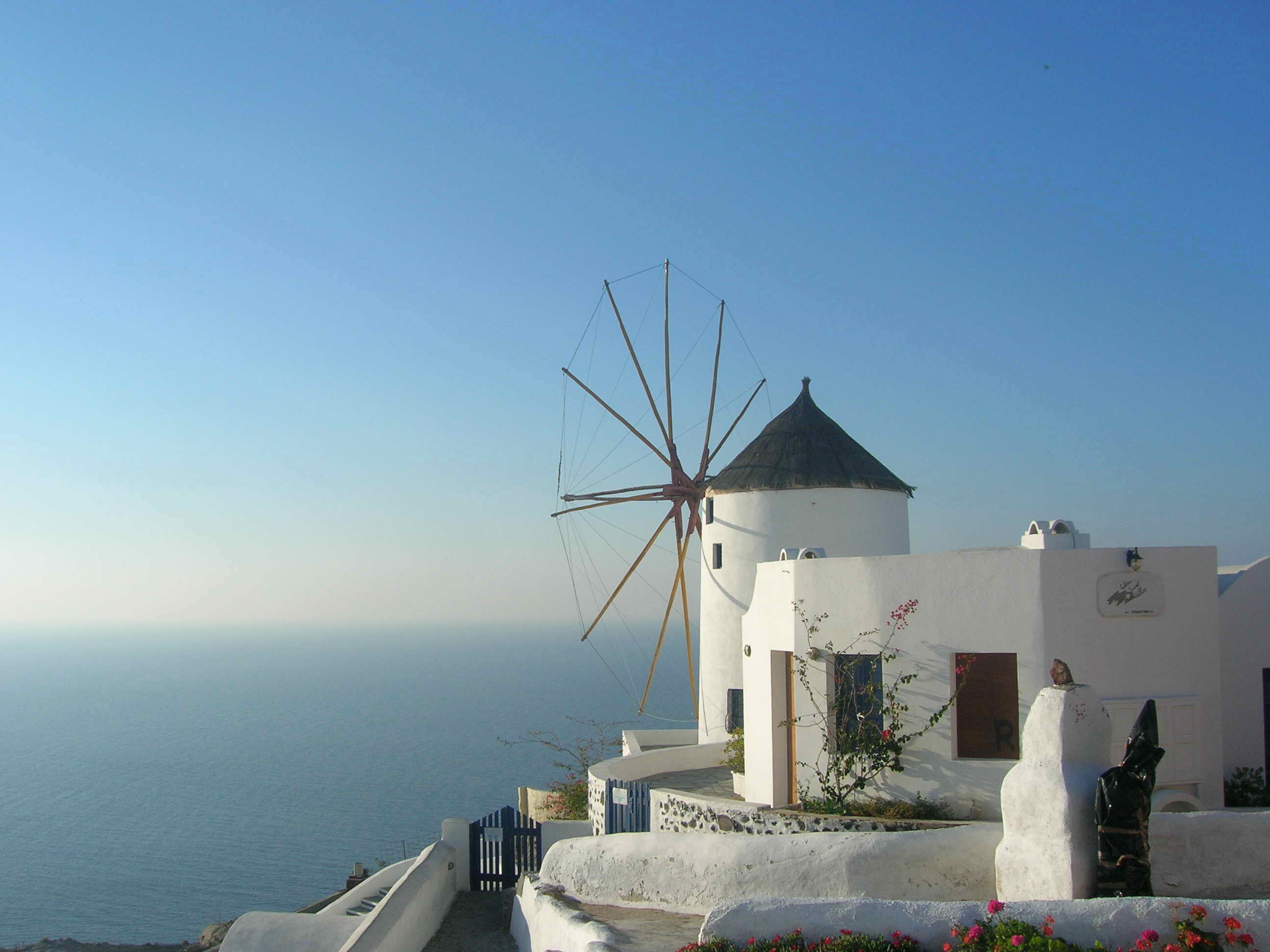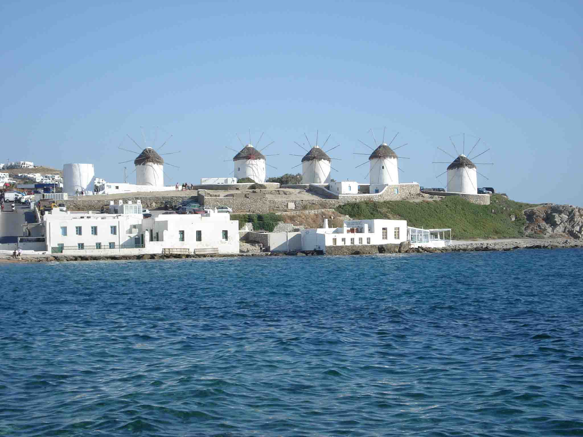 米克諾斯島是希臘南部基克拉澤群島中的一座,也是愛(ài)琴海上最享盛名的度假島嶼之一。島上居民很少,每年大約半年的非旅游時(shí)間,島上相當(dāng)安靜。四月以后,旅游季節(jié)開(kāi)始了,來(lái)自世界各地的游客就像候鳥(niǎo)一樣絡(luò)繹不絕地飛來(lái)島上,享受地中海的陽(yáng)光和海灘。在島上漫步,看到房頂都是用大石塊壘起的平頂,覺(jué)得很奇怪。問(wèn)了當(dāng)?shù)氐木用窈蟛胖溃瑣u上冬天寒冷,風(fēng)特別大,只有這些結(jié)實(shí)的屋頂才能抵御寒風(fēng)。在島西南面海邊的小山丘上,有5座基克拉澤式的風(fēng)車(chē),這是米克諾斯島的標(biāo)志。