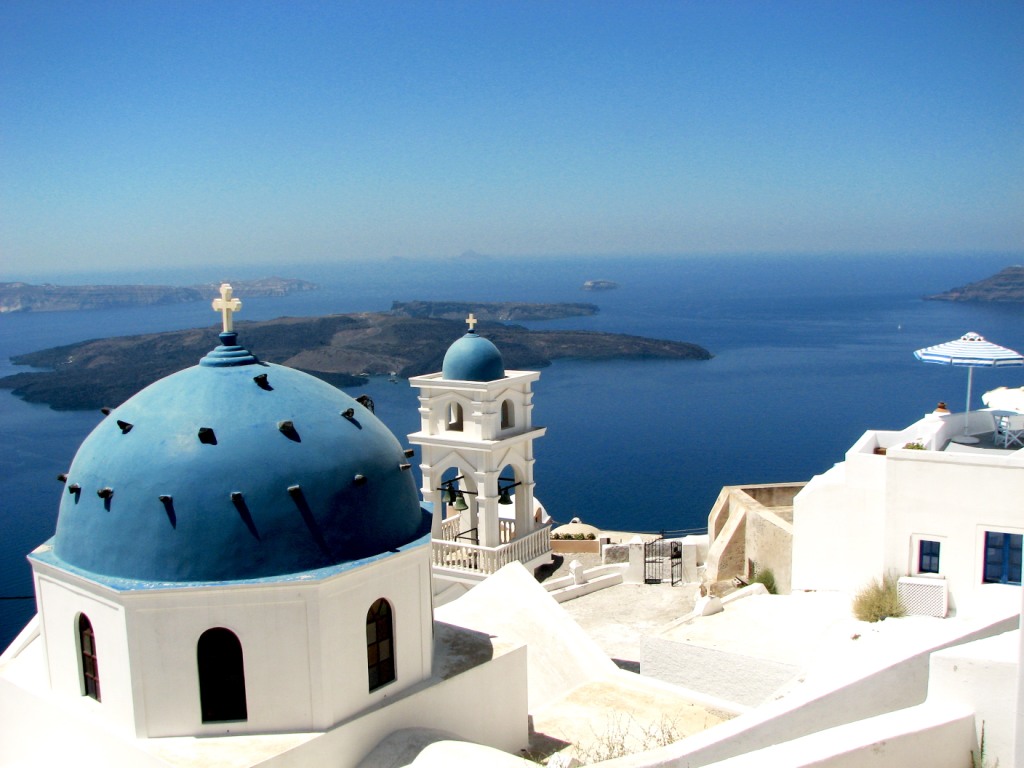 從米克諾斯島乘船到圣特里尼島約需5小時(shí)航程。來(lái)到以后,才知道很多觀光手冊(cè)和旅行社都把米克諾斯島和圣特里尼島作為推薦給游客的首選,是不無(wú)道理的。我們的油輪剛靠岸,大家就驚奇地發(fā)覺(jué),海邊陡峭的山崖呈紅褐色,山崖的頂端是一片白色的房屋,小巧明麗。據(jù)說(shuō),該島位于世界兩大大陸板塊最深的海溝之間,原來(lái)是圓形的。3500年之前的一次火山爆發(fā),島嶼被震出一個(gè)大洞,一大塊月牙形的就成了主島,周?chē)€有幾個(gè)小島,其中一個(gè)小島納亞卡美尼至今還是活火山。