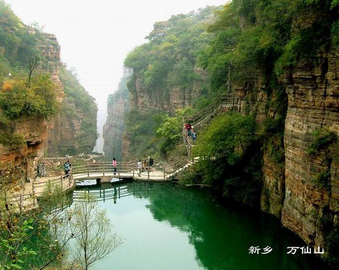風(fēng)光旖旎,景色秀麗的萬仙山位于太行山南麓,至峰頂可遠(yuǎn)眺黃河,俯瞰牧野,一覽逶迤群山。萬仙山匯聚百里太行赤巖絕壁的精華,赤紅色的懸崖高越百米,似凝固的巖瀑石幕,曲折、盤旋、迂回、流暢的圍、隔、堵、截出八條深澗峽谷。飛瀑、洞穴、老樹、古寨、石墻、石街、石房子組成一個(gè)個(gè)鮮亮的景點(diǎn)。