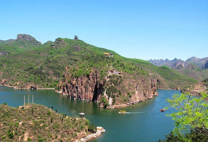 后段為京娘峽,原名三層門。后因此處所傳趙匡胤千里送京娘的故事而改稱現(xiàn)名,左側(cè)山崖上有京娘梳妝臺遺址。這里峭壁高懸,若乘舟入谷,仰望藍(lán)天一線,俯視碧水一帶,大有“峰與天關(guān)接,舟從地窟行“之感。