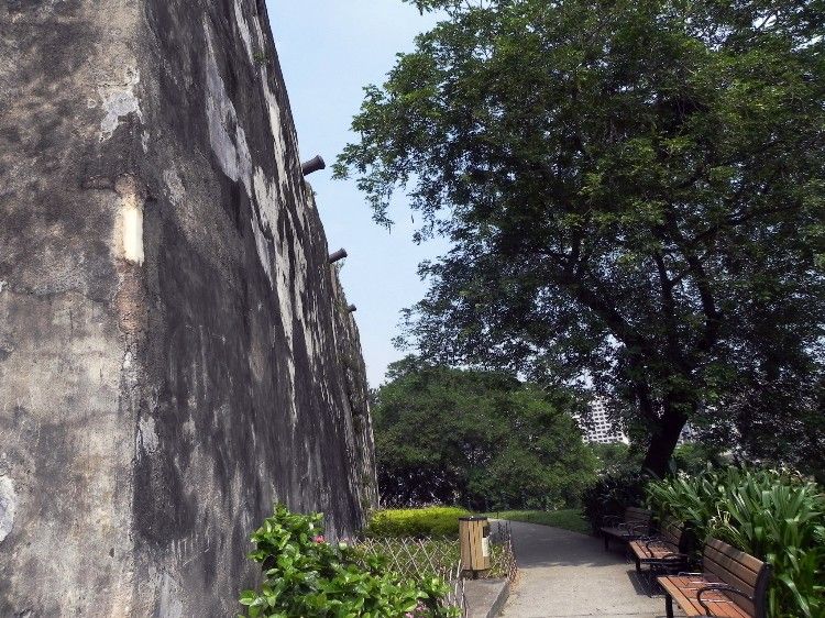 炮臺占地約一萬平方米,呈不規(guī)則四邊形,版權(quán)所有山東聊城聊之旅國際旅行社有限公司,轉(zhuǎn)載必究!邊長均約為100米,四個墻角外突成為棱堡,炮臺東北、西南及東南面墻身建基于3.7 米寬的花崗石基礎(chǔ)上,墻身以夯土砌建,并以蠔殼粉末作灰泥批蕩,堅實(shí)非常,墻高約9 米,往上收窄成2.7 米寬。女兒墻高約2 米,成雉堞狀,可架設(shè)多達(dá)32門大炮,以防范來自此兩方向之攻擊。東南墻兩角更設(shè)有碉堡。面向中國大陸的西北墻身,主要以花崗石砌筑,女兒墻較矮且沒有炮口設(shè)置,這主要顯示其對海外的防御作用以及對當(dāng)時中國官方的友好姿態(tài)。