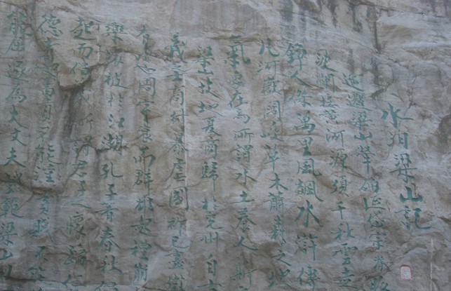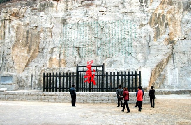 《水泊梁山記》是著名書畫大師范曾2002年專為水泊梁山風景區(qū)撰寫。先生懷著對英雄故里的一腔深情,慷慨揮毫、步其先人范仲淹《岳陽樓記》韻,全文368字,描述了水泊梁山河岳闊峻、草木蕭森的雄奇景象。《水泊梁山記》大型摩崖石刻,通高7米、長14米,距地面10余米,單字最大55厘米見方,最小字30厘米見方,通篇368字占地近100平方米,氣勢恢弘、蔚為大觀,形成了南有《岳陽樓記》、北有《水泊梁山記》的文化格局。為旅游勝地水泊梁山再添景觀,現(xiàn)為水泊梁山風景區(qū)的主要景點之一。與梁山粗獷豪放的山體及周圍環(huán)境交融,深化了景區(qū)的水滸文化內(nèi)涵,成為進入梁山風景區(qū)山寨景區(qū)的標志性景觀,其所在廣場,亦成為在梁山舉行的與水滸、旅游有關(guān)的大型集會的場所之一。