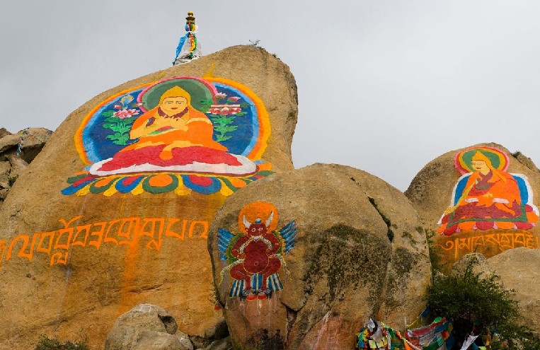 措欽大殿里還保存有二到四世達(dá)賴?yán)锏撵`塔。大殿四壁,繪有許多精彩壁畫,有釋迦牟尼的百行轉(zhuǎn)圖、人間形成圖、生死輪回圖等。措欽大殿東邊有一個(gè)半地下的很小的山洞,只能容一個(gè)人進(jìn)入,名叫“讓迥瑪”。它原來是宗喀巴關(guān)靜修的地方,也是哲蚌寺最早的建筑。