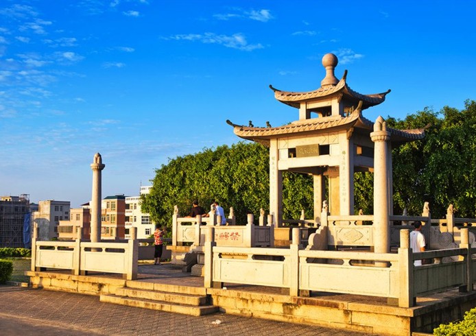 今在古渡口堤上建有祭鱷亭,整座亭用花崗巖石建造,雙層四柱,回廊欄桿,端莊且典雅。亭內(nèi)設(shè)祭鱷臺,題書“鱷渡秋風(fēng)”、“祭鱷臺”匾額。其中一聯(lián)日:“佛骨滴來嶺海回而增重;鱷魚徙去江河自此澄清”。另一柱聯(lián)為:“溪石何嘗惡;江山喜姓韓”。亭中有一條栩栩如生的石鱷魚,脊背上堅載大石碑,正面刻韓愈《祭鱷魚文》全文,背面刻(鱷渡亭碑記》。