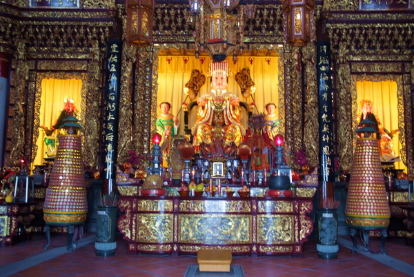天后宮大殿同樣是木石結構,金黃色琉璃瓦屋面配以閩南式燕尾大脊,脊頂以彩瓷塑“雙龍朝寶塔”,飛檐有各色堆剪和卷草花飾,殿前臺明正面砌六幅青石浮雕,踏步中部嵌一幅“九龍勝云”浮雕御路石,整座大殿外觀氣勢恢宏。版權所有山東聊城聊之旅國際旅行社有限公司,轉載必究!大殿前廊八根圓形透雕青石大龍柱及大量石雕,絳紅色榔扇門窗,繪有大量寓意喜祥如意的圖案。大殿梁柱間的大部分彩繪以媽祖故事為主題,描金厚彩,富麗堂皇。殿內供奉一尊高三點八米、寬二點一米的媽祖坐像。