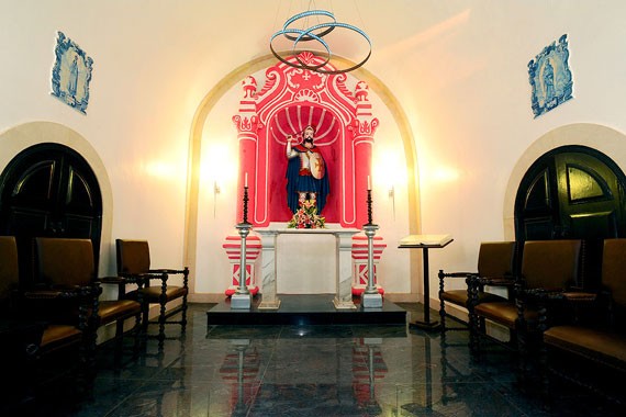 這座精致的小堂于1629年興建,于1740年重建于媽閣炮臺上, 即在澳門這個(gè)小城的尾端。當(dāng)時(shí),小教堂巳是一所葡式旅館建筑物的一部份,而旅館則建于炮臺的地基上,在這座精致的小教堂擺放圣人雕像及花地瑪圣母,伊莎貝皇后的瓷磚圖像。