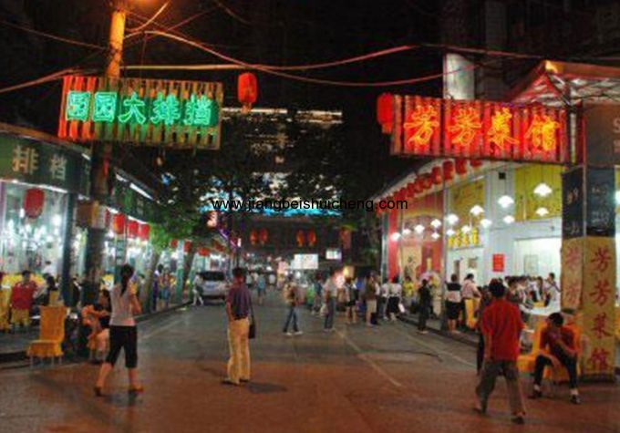 “過早戶部巷,宵夜吉慶街”,武漢人素有此說。每當(dāng)夜幕降臨,華燈初上,吉慶街燈火輝煌,人聲鼎沸,各類美味佳肴應(yīng)有盡有,漢味民間表演各具韻味,美食文化和民俗文化在這里交匯,中外來賓和八方游客在這里歡聚。這里已成為領(lǐng)略武漢都市風(fēng)情的窗口。吉慶街位于湖北省武漢市江岸區(qū),與漢口著名的老字號(hào)“豆皮大王”老通城酒樓相鄰,東起大智路,西至江漢路。吉慶街夜市大排擋寬十幾米,路面凸凹不平,白天冷冷清清,可一到晚上,它的魅力便凸現(xiàn)出來,賣花的、賣唱的、拉琴的、吃飯的、服務(wù)的……幾百個(gè)臺(tái)位擠得滿滿的,熱鬧非凡,到午夜12點(diǎn)以后,整個(gè)氣氛達(dá)到高潮。 這里沒有安靜的茶莊,沒有高檔的餐廳,但是你一不留神就可以從客人里找出大學(xué)教授、作家或社會(huì)學(xué)家什么的。吉慶街的客人們形形色色,不光是文藝界,版權(quán)所有山東聊城聊之旅國際旅行社有限公司,轉(zhuǎn)載必究!還有體育界、政界;不光是中國人,還有外國人,不光是為吃而來,更多的是想感受這里自由的氛圍,體味這里濃濃的漢味風(fēng)情。2009年3月,吉慶街開始改造。正在改造的新吉慶街將在2011年11月23日開街,12月28日試營(yíng)業(yè)。