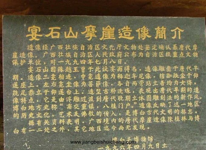 宴石寺正門上書有“宴石寺”三字。它的門聯(lián)和重門聯(lián)為:“宴會群仙地,石開一洞開”、“宴石鐘靈千古秀,仙橋毓秀萬年居”聯(lián)首分別嵌上“宴石”和“宴石仙橋”顯然把宴石寺、宴石山、宴石仙橋三景融為一體。宴石山壁立如削,寺頂平坦,密草叢叢,荊蘿盤生,輕紗般的霧靄在林間回蕩飄逸。版權(quán)所有山東聊城聊之旅國際旅行社有限公司,轉(zhuǎn)載必究!往昔,山頂正中有一泓清泉,波光如鏡,池中五彩斑斕的菩薩魚與藍天白云相映,恍如神魚遨游蒼穹;山頂清泉從峭壁上飛瀉而下,擊中陡崖的凸處,濺起霧珠,被陽光染成七色彩珠,仿佛為宴石寺石山披上一輪佛光,讓人更添神往。站在宴石山頂向東望去約10公里有雞婆石,它象一個正孵蛋的母雞蹲在雞窩中,在它的背脊上有一個歪著腦袋窺天的“雛雞”,筆者曾爬上過此山,僅用一個手指就算有百十人共同出力,也休想挪開它半寸。向南看,蜿蜒的南流江下游約3公里,在兩處山峽間有一個大平湖,這就是東漢伏波將軍馬援當年為平交趾叛亂,動用十萬兵士疏鑿出來的馬門灘。向西看去,巍峨雄偉的云飛樟矗立天極,它的身后就是峰巒疊嶂的六萬大山。向北觀看,遠處是煙靄籠罩的博白城;中間有一座昂天嘯吼的獅子石山,它口中冉冉騰起熱浪直沖云霄;近處又是丹霞地貌最典型的紫陽冠了,它像一定圓形的禮帽,扣在地表上。在宴石山頂,山風(fēng)習(xí)習(xí),颯氣沐身,環(huán)顧四周,頓覺宴石山成了宇宙的中心,整個乾坤都渺小了。再有江東岸寺西石壁上鐫有神像三尊。摩崖造像雕鑿在離河面約15米的紅砂巖石崖壁上,高三米。中龕坐佛一尊,左右龕為一佛二菩薩。佛像頭部長方形,兩耳垂肩,身披袈裟,袒右肩,結(jié)跏跌坐于束腰式須彌高蓮座上。左右兩龕佛座各辟一小龕,內(nèi)雕獸頭。造像無題記,從雕刻風(fēng)格及其造型、面像、服飾分析,應(yīng)是隋唐或水稍前刻成,自治區(qū)旅游局認定是“廣西第一摩崖”,是目前廣西境內(nèi)已知年代最早的摩崖造像之一。摩崖造像地處漢、唐中原交趾(今越南)交通要道南流江畔,為研究我國佛教的發(fā)展和南傳提供了可貴的資料。清道光十二年縣志載,摩崖旁“有臨江巨佛一座,高五十余丈,未窮何年所鑿”。遺憾的是,此巨佛在清末或民國初已倒塌跌落江中,現(xiàn)僅留佛座底裙,尚依稀可辨。