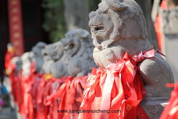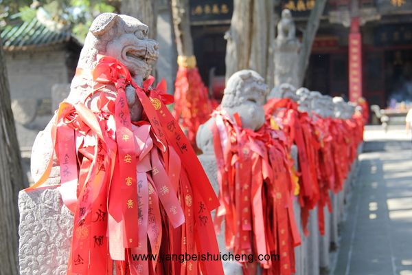 穿過儀門,你將看到一條我國(guó)關(guān)廟中惟一的石獅甬道。在長(zhǎng)約35米的古甬道上,共有大小石獅104尊安坐兩側(cè)甬柱頂上,大獅姿態(tài)安詳,小獅活潑可愛,百獅百態(tài),讓人稱奇。