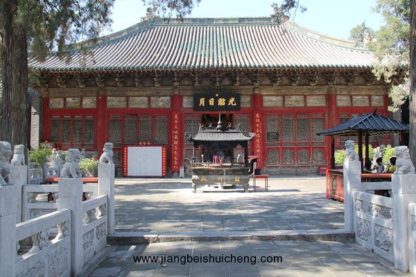 關(guān)林二殿,五開間,廡殿式,門上懸掛著"光昭日月"匾額,是清光緒帝御題。殿中塑關(guān)羽怒視東吳像,左側(cè)站著手棒大印的關(guān)平、右側(cè)站著手持大刀的周倉(cāng)。二殿左右各建有一座硬山式的陪殿,左為張候殿,右為五虎殿。三殿硬山式,面闊五間,規(guī)模較小,內(nèi)塑關(guān)羽夜讀春秋像、關(guān)羽出行圖和睡像,故又稱寢殿。