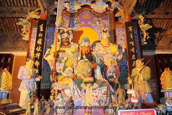 走進(jìn)大殿,關(guān)羽金身端坐眼前,它頭戴十二冕旒帝王冠,身穿錦緞繡龍袍,手持一把標(biāo)明身份的“七星”護(hù)板,莊嚴(yán)肅穆。該塑像是1986年仿塑的,原來的塑像在文革中被毀掉了。原像是金身帝王像,是在康熙四年加封關(guān)公為帝后以帝制塑造的。