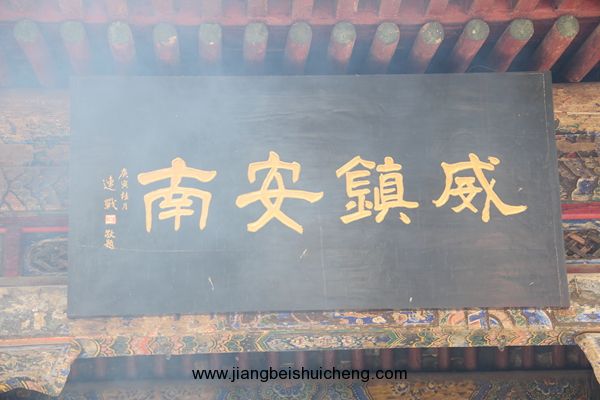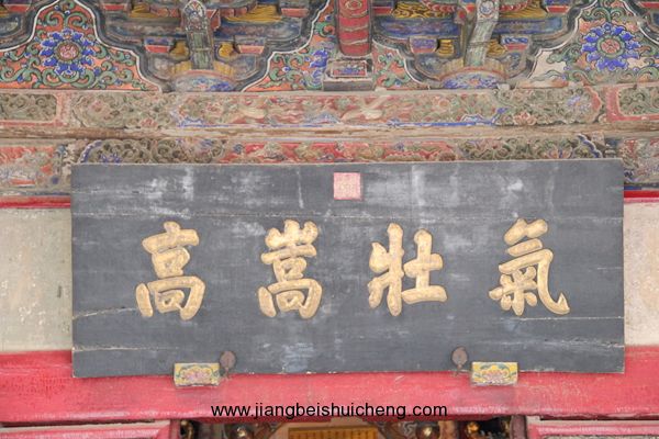 仰面觀之,有一塊大匾高高懸在大門上,上書“聲靈于鑠”四個(gè)大字,寓意關(guān)公美好的聲名象美好的音樂一樣傳揚(yáng)四方。這塊匾是清乾隆十五年乾隆帝所題,同時(shí)兩側(cè)并題有聯(lián)曰:“翊漢表神功龍門并峻,扶綱伸浩氣伊水同流。”由此可以看出,不僅百姓敬仰關(guān)公,古代帝王對(duì)關(guān)公也同樣尊崇。