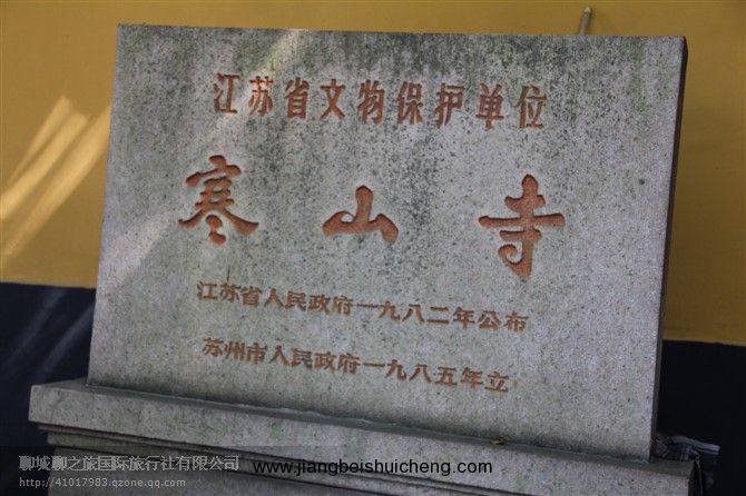 寒山寺(Hanshan Temple) 寒山寺在蘇州城西閶門外5公里外的楓橋鎮(zhèn),建于六朝時(shí)期的梁代天監(jiān)年間(公元502-519年),距今已有1400多年。原名“妙利普明塔院”。唐代貞觀年間,傳說(shuō)當(dāng)時(shí)的名僧寒山和拾得曾由天臺(tái)山來(lái)此住持,改名寒山寺。今天我們的導(dǎo)游就帶大家來(lái)到了蘇州,看一下寒山寺。