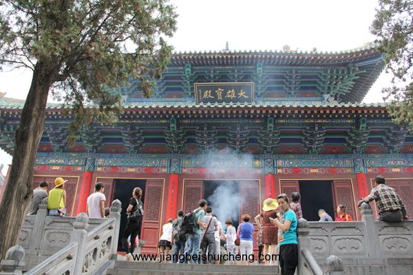 穿過天王殿,其后有大雄寶殿。殿內(nèi)供奉著釋迦牟尼、阿彌陀佛、藥師佛的神像,屏墻后面懸塑觀音像,兩側(cè)有十八羅漢侍立。大雄寶殿之后,又有藏經(jīng)閣藏書八百萬卷,這是寺僧藏經(jīng)說法的場(chǎng)所。