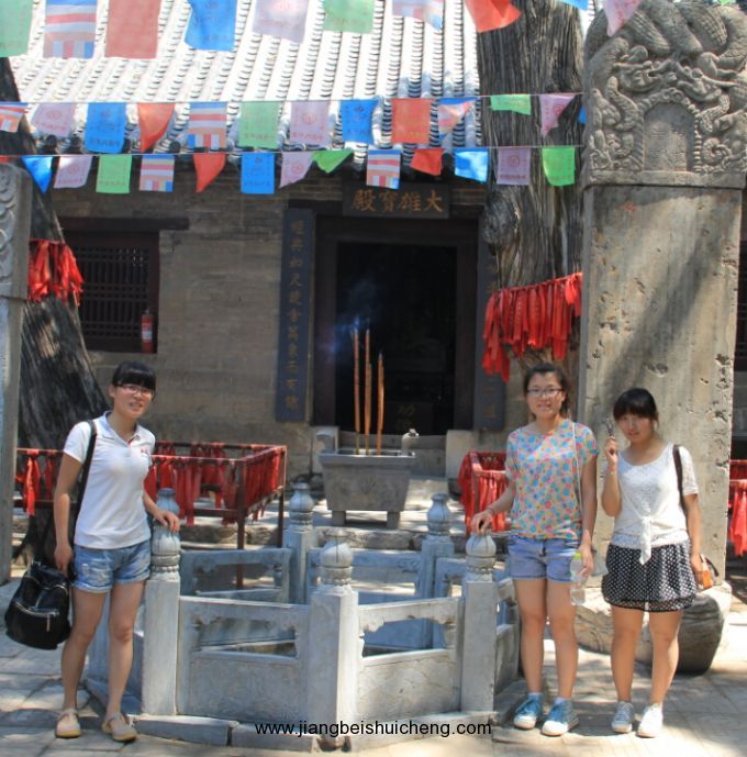 寺院有大雄寶殿、藏經閣以及左右配殿和后殿,為前后雙重院建筑。殿內雕梁畫棟,繪滿壁畫,甚為美觀。殿前唐柏兩棵,一為“雀柏”,一為“血柏”,樹干粗大,參天蔽日,掩映佛殿。院內左前方有明代萬歷七年重修的全石質結構鐘樓,四角攢頂,石柱上題記多處,造型精美,是不可多得的明代鐘樓建筑。寺院東即為“馬跑泉”、石室洞奇觀,洞口上有清康熙年間地方名人馬光遠書寫的泉名。通過玻璃,發(fā)現洞內泉水依稀看見,據說終年不斷,流出洞外順著人工開鑿的石槽流入寺內荷花池內。寺內一操四川口音的年長和尚,熱情地給人們作著講解。