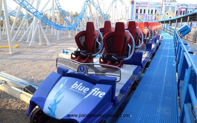鎮(zhèn)園之寶世界之最——藍(lán)火過山車,由德國馬克公司原裝進(jìn)口,總造價1.2億,全長1098米,至高點38米,最高時速可達(dá)100公里,采用火箭發(fā)射式原理,讓游客體驗瞬間離地的超刺激、驚險快感。