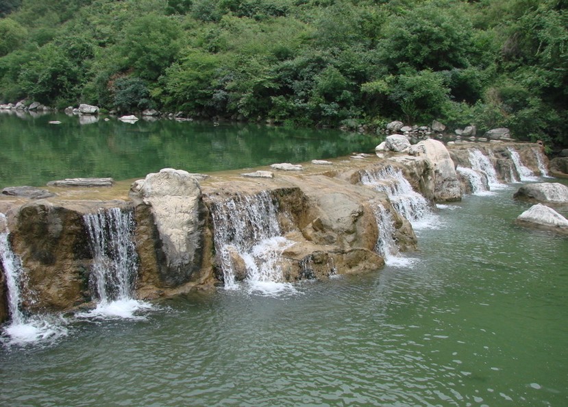 三、潭瀑峽地處云臺(tái)山北部略偏西,是主要河流子房河的一個(gè)源頭。溝長2000米,南北走向。溝東面,峭壁聳翠,基巖裸體。溝西面,競秀峰參差俏麗,峰群一字排列,峰峰直立,爭奇斗異。在曲曲彎彎的溝槽內(nèi),瀠洄著一條會(huì)唱歌、會(huì)跳舞的溪水。這條能歌善舞的溪水叫小龍溪。它的溪床,由一層層高低不一、色彩有別、寬窄不同、曲折有致、形態(tài)各異的自然山石臺(tái)階所組成。小龍溪?jiǎng)t像一隊(duì)美麗的歌舞明星,以層層臺(tái)階作舞臺(tái)載歌載舞,翩翩歷階而下。并在每個(gè)石階舞臺(tái)上,表演出精彩的節(jié)目,奉獻(xiàn)出妙不可言的美景。或碧波蕩漾,或?yàn)橄迹蚍炙镐讣?xì)流,或匯合湍湍激流,或傾瀉、或跌落成為銀光閃閃的瀑布,瀑下積水,成為彩潭。色澤悅目,清音悅耳。承蒙大自然造化的神奇,逆水而行,有如游仙,步步引人入勝,美景層出不窮,好戲連臺(tái),演奏出十二部美好的山水樂章。即:迎賓第一潭、九對情人、翡翠仙子、金潭銀瀑、丫字瀑潭、群芳競秀、隋唐山寨、清漪仙池、水簾仙居、碧玉仙子、仙蹤劍影、龍鳳呈祥。