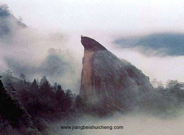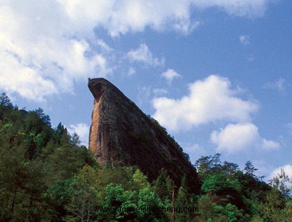 從天車架往西行約數(shù)百米,便可看見一座形似雄鷹的巨巖。“雄鷹獨立健無倫,銳喙昂頭實逼真。豈是神山厭凡鳥,欲君奮擊絕器塵”。形象、生動地描繪出了鷹嘴巖的雄姿。鷹嘴巖在章堂澗南側(cè),如一頭向東昂首的雄鷹,嘴中含(生)著一株刺柏,形象奇妙,是武夷九十九巖中最好的一景。鷹嘴巖北有丹霞嶂,處在章堂澗邊,壁上有洞,相傳太平天國時,崇安城內(nèi)一富豪懼怕農(nóng)民起義軍對他清算,攜眷逃避來此,藏身洞中。后來他在洞中建造了樓閣,并裝上轆轤便于上下,人稱天車架。版權(quán)所有山東聊城聊之旅國際旅行社有限公司,轉(zhuǎn)載必究!今樓閣已荒廢,天車架也已不存,僅留遺跡供人觀看,成為一景。鷹嘴巖是一座渾然一體的巨巖,光禿禿的巖頂,東端向前突出,尖曲如喙。出奇的是,鉤形的“鷹嘴”上竟然生長首一株枝干虬屈的古老刺柏,給鷹嘴增添了幾分飄逸,幾許神采,從巖頂直削而下的巖壁,光潤瑩潔,白里透紅,而微微拱起的巖脊卻是一片蒼黑,隱隱約約地現(xiàn)出一條條裂紋,猶如豐滿的羽翼。佇立在章堂澗旁仰望鷹嘴巖,只見它兀立峰巔,翹首藍(lán)天,勢欲振翅高翔,搏擊蒼穹,無比雄偉壯觀。
