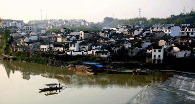 站在石壩上,舉首四望,氣象萬(wàn)千,盡收眼底。壩上碧波如鏡,魚(yú)翔深潭,小舟撥浪,激起漣漪,恬靜安閑。壩下亂石嶙峋,浪峰咬石;西岸巍然屹立的紫陽(yáng)山,林木蔥郁;建于明代的紫陽(yáng)橋,宛若彩虹橫臥清波,此橋長(zhǎng)140米,高14米,寬10米,在歙縣城的三座古橋中最高、最寬,因橋的上游即為徽商行舟的碼頭,所以橋孔建得比一般橋要高大得多,以便行舟過(guò)帆。