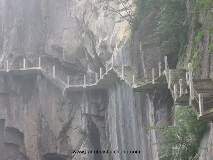 天都峰,途中有一段長(zhǎng)10余米,寬僅1米的“鯽魚背”,兩側(cè)是千仞懸崖,深邃莫測(cè),其形頗似出沒(méi)于波濤之中的魚之背,故名。自上而下,坡陡達(dá)85度左右,若遇風(fēng)吹云涌,仿佛山搖石動(dòng),游客至此無(wú)不戰(zhàn)戰(zhàn)兢兢,有“天都欲上路難通”感慨。民國(guó)二十六年(1937)建登峰梯道,長(zhǎng)3里,有1564級(jí)臺(tái)階,194個(gè)石欄干和600米鐵索,保障游人安全攀登絕頂。1984年于峰腰另辟新徑至峰頂。站在峰頭遠(yuǎn)眺,云山相接,江河一線,俯瞰群山,千峰競(jìng)秀,風(fēng)光無(wú)比壯麗。古有詩(shī)贊曰:“任他五岳歸來(lái)客,一見天都也叫奇。”民謠云:“不到天都峰,白跑一場(chǎng)空。”意為此峰為游黃山必游之地。
