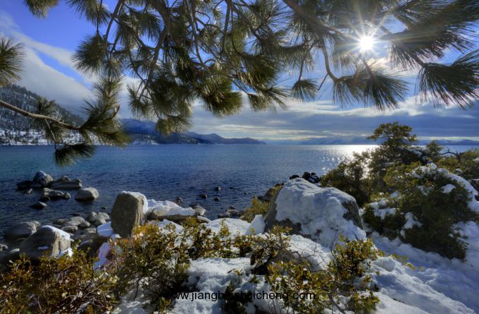 太浩湖是位于美國加州與內(nèi)華達(dá)州之間的高山湖泊,海拔6225 尺,22 哩長、12 哩寬,并有 72 哩長的湖岸,四周由山峰環(huán)抱,湖水澄凈湛藍(lán),冬天降雪期長達(dá) 8 個月,路面經(jīng)常積雪盈尺,但湖底異常的深,最深處達(dá)1645尺,湖水卻不會結(jié)冰。