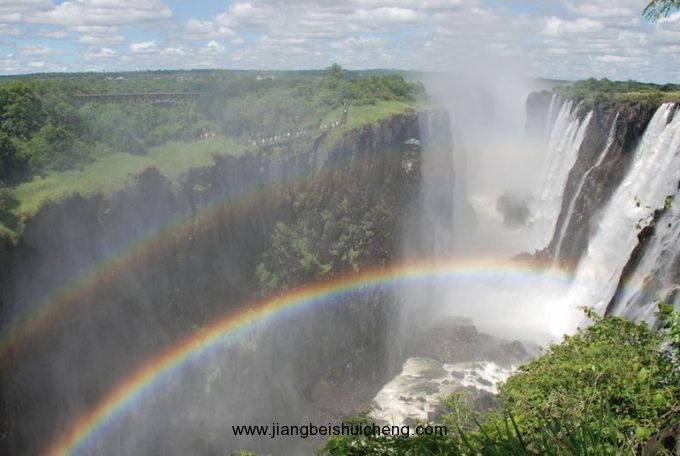 維多利亞瀑布的寬度和高度比尼亞加拉瀑布大一倍。年平均流量約935立方米/秒(33,000立方英尺/秒)。廣闊的贊比西河在流抵瀑布之前,舒緩地流動在寬淺的玄武巖河床上,然後突然從約50米(150英尺)的陡崖上跌入深邃的峽谷。主瀑布被河間巖島分割成數(shù)股,浪花濺起達300米(1,000英尺),遠自65公里(40英里)之外便可見到。每逢新月升起,水霧中映出光彩奪目的月虹,景色十分迷人。瀑布聲如雷鳴,當?shù)乜迓?洛齊(Kalolo-Lozi)族居民稱之為“莫西奧圖尼亞”(Mosi-oa-tunya),意即“霹靂之霧”。據(jù)考證,遠在公元90年即有少數(shù)農(nóng)業(yè)人口在贊比西河兩岸定居。版權(quán)所有山東聊城聊之旅國際旅行社有限公司,轉(zhuǎn)載必究!多數(shù)原住民則在距瀑布半徑128公里(80英里)范圍內(nèi)以漁獵為生。今日當?shù)夭孔逵袞|加人、洛齊人、萊雅人(Leya)、托卡人(Toka)和蘇比亞人(Subia)。東加人每年在瀑布旁舉行雨祭,將黑色公牛扔入峽底祭奠河神。1855年11月16日,英國探險家利文斯頓(David Livingstone)抵達瀑布所在地,為第一個見到該瀑布的白人。1905年在瀑布附近的峽谷上建成跨度200米(657英尺)的拱形鐵路公路兩用橋。贊比亞一側(cè)建有兩座水電站,發(fā)電能力共10萬千瓦。維多利亞瀑布國家公園與李文斯頓狩獵公園形成瀑布地區(qū)。瀑布地區(qū)已成為非洲著名旅游勝地。