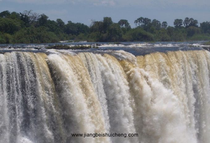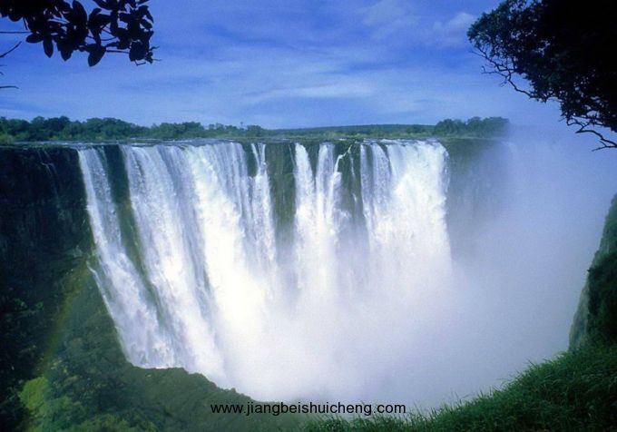 非洲第四大河的贊比西河滾滾流到這里,在寬約1800米的峭壁上驟然翻身,萬頃銀濤整個跌入約110米深的峽谷中,卷起千堆雪,萬重霧,只見雪浪騰翻,湍流怒涌,萬雷轟鳴,動地驚天,濺起的白色水霧,有如片片白云和輕煙在空中繚繞,巨響和飛霧可遠及15公里。