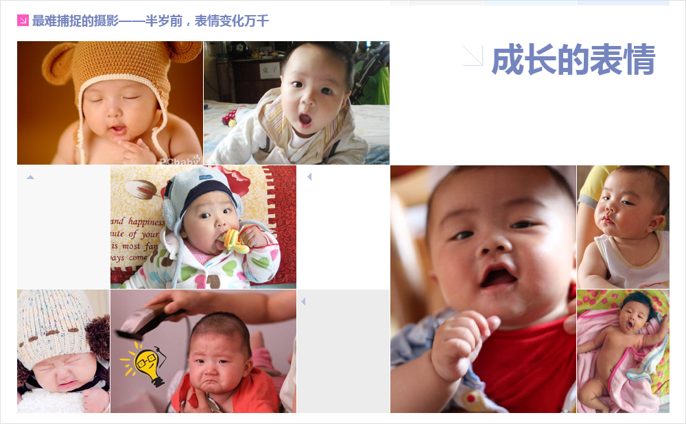 1、決定拍攝間隔:每周甚至每日一張當然很有趣,但這涉及太多工作,一年要拍攝52張指定的照片甚至要365張,并非易事。由零到兩歲,每月一張看來間隔上比較理想,看到分別,又不至于太疏落。