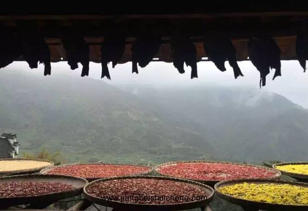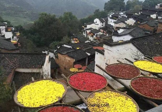 篁嶺古村數(shù)百棟徽派古民居在百米落差的坡面錯(cuò)落有序,整個(gè)山間村落飽經(jīng)滄桑的徽式民居土磚外墻與曬架上、圓圓曬匾里五彩繽紛豐收果實(shí)組合,繪就出世界獨(dú)一無(wú)二的“曬秋”農(nóng)俗景觀、最美的鄉(xiāng)村符號(hào)。